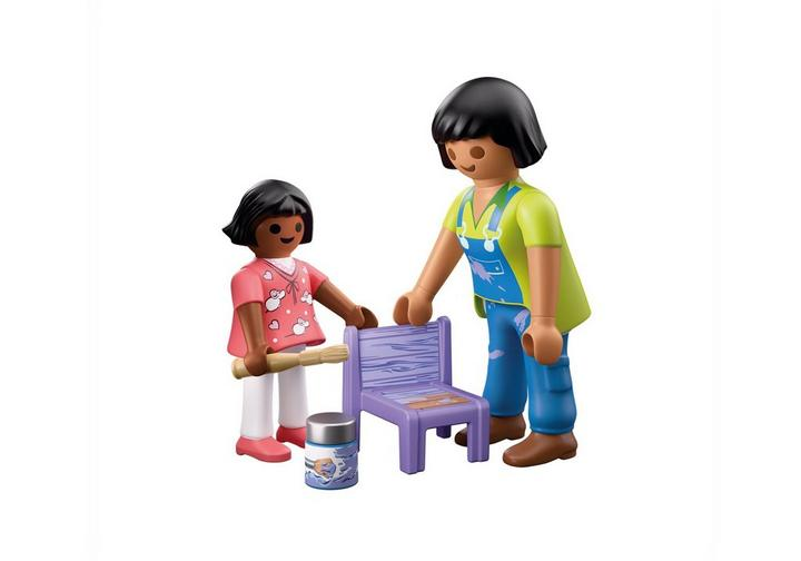 Das Set enthält zwei Spielfiguren, einen Stuhl und liebevoll gestaltetes Malzubehör – perfekt für farbenfrohes Rollenspiel und kleine Geschichten aus dem Kunstunterricht.