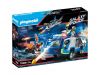 Who ensures law and order in space? Of course the PLAYMOBIL Galaxy Police. Against the clever officers with their versatile Galaxy Police truck, villains don't stand a chance even in the infinite expanses of space. If a villain is on the run, the two policemen immediately jump into the cockpit of their truck, switch on the flashing light and start the pursuit. The space pirate flees on his flight glider - now it's time to be fast. The police officers extend the rocket ramp on the roof and fire a warning shot. This fugitive has to make an emergency landing. Now the policemen grab him and it goes off into the prison capsule. This was not how the rogue had imagined his escape.The playset consists of three PLAYMOBIL figures, a police truck with a folding cockpit, an extendable rocket ramp with projectiles and prison capsule, and an air glider. In the glider is space for one figure.