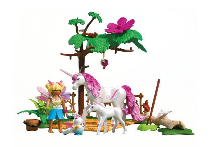 In a dreamy forest clearing, a hidden haven awaits – home to a gentle unicorn and her playful foal. Under a leafy canopy, magical moments unfold as the fairy and her joyful companion care for their mystical friends. A bottle of milk, a splash of water, and plenty of cuddles bring the scene to life.