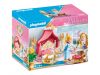 This bedroom is simply gorgeous. Before the princess lies down to sleep in the golden four-poster bed, she sits down at her magnificent dressing table. First she takes off her crown and then brushes her blond hair in front of the golden mirror. She keeps her jewelry in the chest. Now she slips into bed and cuddles up in the pillow. Sweet dreams, princess! The play set contains a princess with a crown, a four-poster bed, a dressing table with a mirror, two candlesticks and many other royal accessories.Sold out