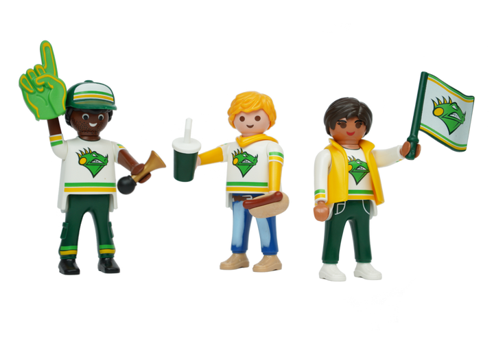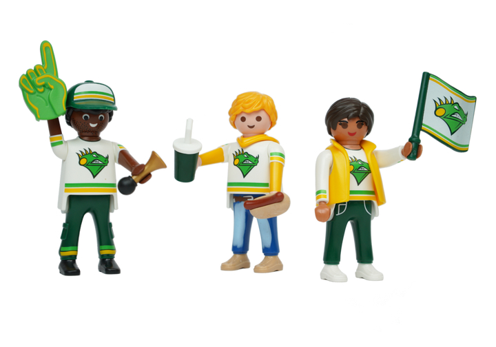 Loyal PLAYMOBIL football fans with hotdog, flag and horn to support their favorite team.