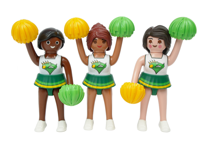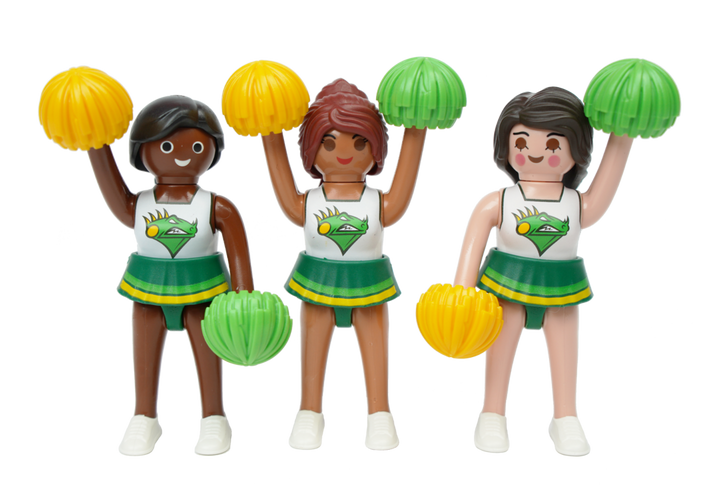 Three PLAYMOBIL football cheerleaders with pompoms.
