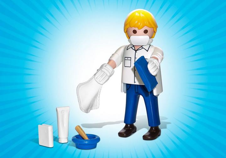 Apotheker met neus- en mondmasker, desinfecterende doek, zalftube, boek en vijzel. PLAYMOBIL ""Dagelijkse helden"" speciaal figuur.