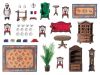 Nostalgic living room furnishings with sofa, bookcase, large table, four chairs, crockery and many extras for happy family gatherings.