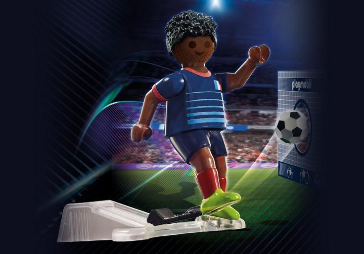 Off to the big tournament with the PLAYMOBIL soccer stars. The soccer player from France gives everything for his team. Which team do you think will win? With the practical one-hand kick function, both flat and high balls can be placed precisely. Includes cardboard goal wall. Combine with the soccer stadium (71120) for even more soccer fun. With the enclosed blank labels, the figure can be individually labeled with the name and serial number of the favorite player.Sold out
