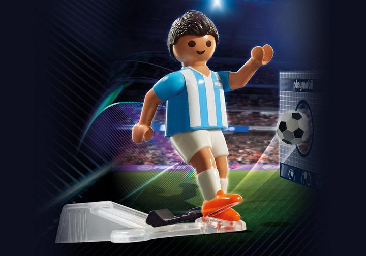 The PLAYMOBIL soccer stars are back in action. The national player from Argentina gives everything for his team. Which team will win? With the practical one-hand kick function, both flat and high balls can be placed precisely. Includes cardboard goal wall. Combine with the soccer stadium (71120) for even more soccer fun. With the enclosed blank labels, the figure can be individually labeled with the name and serial number of the favorite player.Sold out