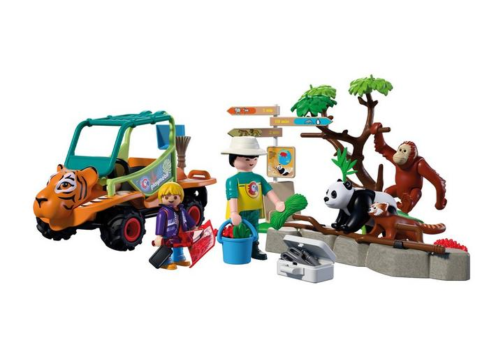 With its striking tiger-head design, the rugged supply vehicle is a real eye-catcher in the Playmo-City Zoo. Today, the zookeeper is delivering food to the panda, red panda, and orangutan in the Asian section of the park. A student gets to accompany him and helps care for the animals. There's space on the loading area for important equipment, and thanks to safety handles, two children can ride along in the back—safe and comfortable.