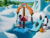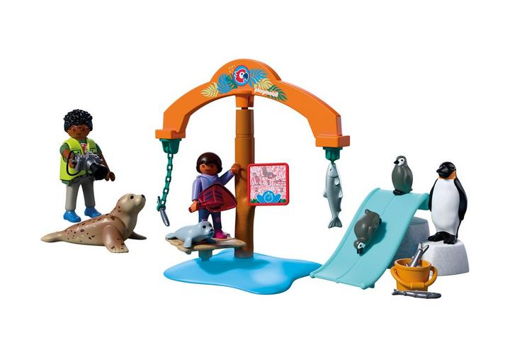On the exciting ice expedition, children discover the world of penguins and seals from Antarctica. Father and daughter watch the lively activity around the large feeding carousel, which can be rotated in all directions and stocked with different types of food. A favorite among the animals: the new double slide, where the emperor penguin whizzes down together with its two chicks.