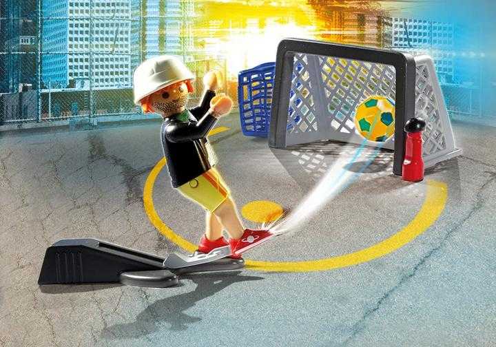 De PLAYMOBIL speelset bevat een straatvoetballer met trapfunctie, een trapapparaat, een klein voetbaldoel, een bal, een net en andere extra's voor spannende voetbalwedstrijden.