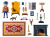Liefdevol ingerichte kamer met open haard met een PLAYMOBIL-figuur, fauteuil, boek, krant, hond en open haard om bij op te warmen.