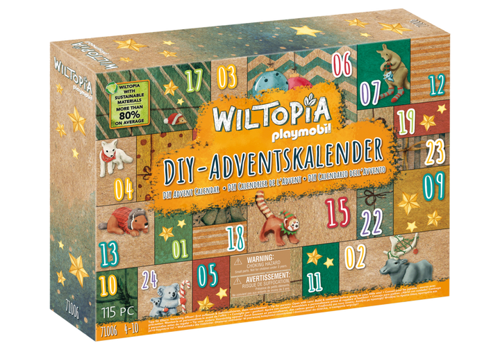 In deze pre-kerstperiode kun je samen met de onderzoeker van de PLAYMOBIL Wiltopia DIY adventskalender op dierenreis rond de wereld. Elke dag kan een van de 23 verschillende dieren van over de hele wereld worden ontdekt en kan hun fascinerende leefgebied worden verkend. De afzonderlijke dozen van de DIY-adventskalender kunnen afzonderlijk worden gevuld. Als de doos na opening wordt omgedraaid, ontstaat tijdens de adventsperiode een geïllustreerde landschapscollage met de leefgebieden van de dieren erin. Voor nog meer creatieve vrijheid wordt een stickervel met letters en dierenfoto's meegeleverd, waarmee de individuele dozen naar wens kunnen worden gedecoreerd. De Wiltopia-serie van PLAYMOBIL staat voor opgroeien in een wereld waar dier en natuur worden gewaardeerd en beschermd, om de wereld te kennen en ervan te houden. Dankzij aanvullende educatieve audio- en video-content combineert Wiltopia games en leren op een unieke manier.Wiltopia - Prachtig voor het milieu