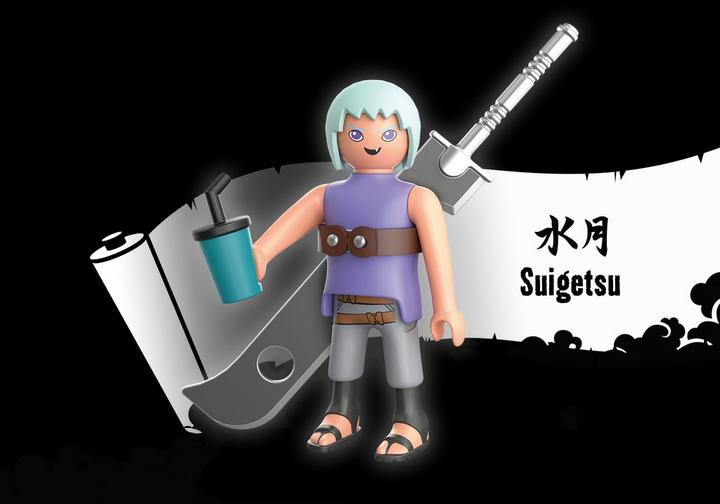 De succesvolle samenwerking tussen PLAYMOBIL en NARUTO gaat de tweede ronde in. Alle anime-fans kunnen zich verheugen op nieuwe personages uit het spannende NARUTO-universum. De creatieve figuren inspireren met veel details, coole accessoires uit de bekende succesvolle serie en zijn de blikvanger in elke vitrine met fan-artikelen.De PLAYMOBIL-set toont het NARUTO SHIPPUDEN-personage Suigetsu in een mouwloos paars shirt met grijze broek en sandalen. Een van zijn hoektanden is te zien in zijn mondhoek. Hij draagt een dikke bruine riem om zijn borst, waaraan zijn zwaard is vastgemaakt.