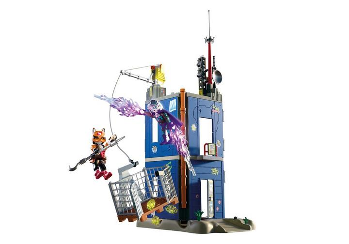 De Helden-Toren is het geheime toevluchtsoord en het commandocentrum van de helden van PLAYMOPOLIS – totdat de buitenaardse superschurk Kronar aanvalt om de krachtige energiestenen te veroveren. De dappere vosheldin Blazetail verdedigt de toren en de geheime schuilplaats onder de houten balken met alle kracht die ze in zich heeft: een beweegbare kraan met tralies dient om helden of schurken vast te zetten, doorbreekbare muren zorgen voor dynamische gevechten en een explosieve vloer op de eerste verdieping zorgt voor spannende verrassingen. Aan de houders op de zijwanden kunnen talrijke verzamelbare PLAYMOBIL-heldenfiguurtjes worden bevestigd. Pure actie in de strijd om PLAYMOPOLIS!